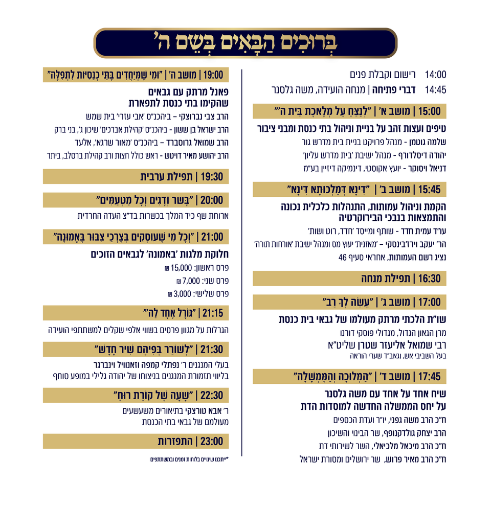 במהלך הועידה יתקיימו פאנלים, ראיונות והרצאות של טובי הדוברים, המומחים ואישי הציבור שישתפו מניסיונם האישי, יתנו את זווית המבט שלהם ויעניקו למשתתפים ידע וכלים שערכם לא יסולא בפז. בין הנושאים שיעלו בועידה: ניהול תקין ויעיל של עמותות, דיון מקצועי וחידושים בתחום הבניה של בתי כנסת ומקוואות, השפעות הממשלה החדשה על מוסדות דת בישראל, שו"ת הלכתי מרתק מעולמו של גבאי בתי הכנסת ועוד.